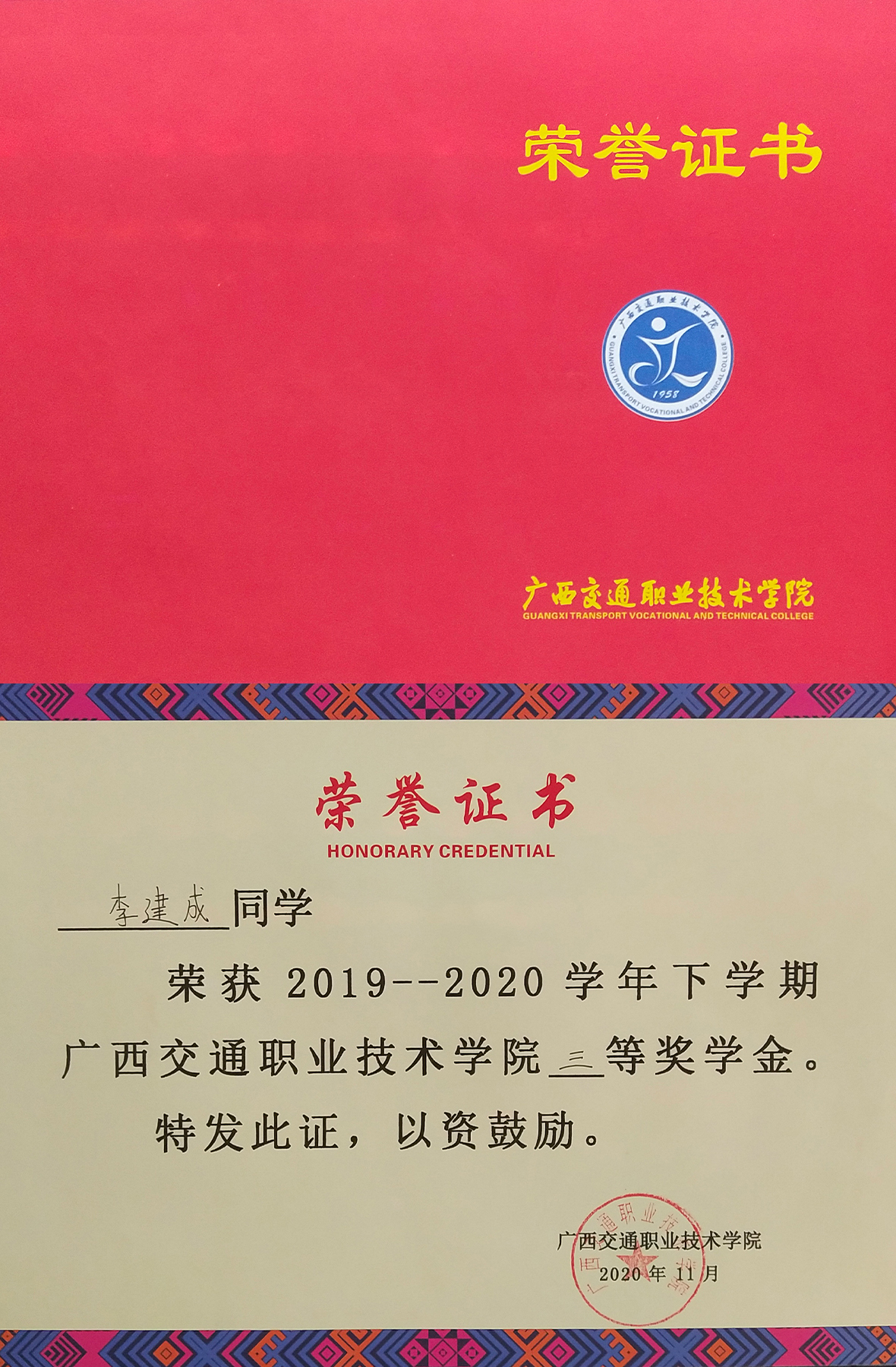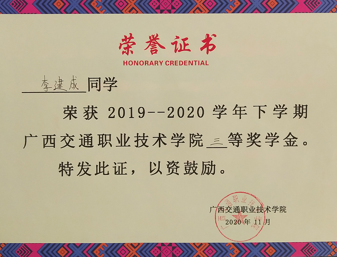 Li Jiancheng won the third class GXJZY scholarship in the second semester of 2019-2020 academic year.