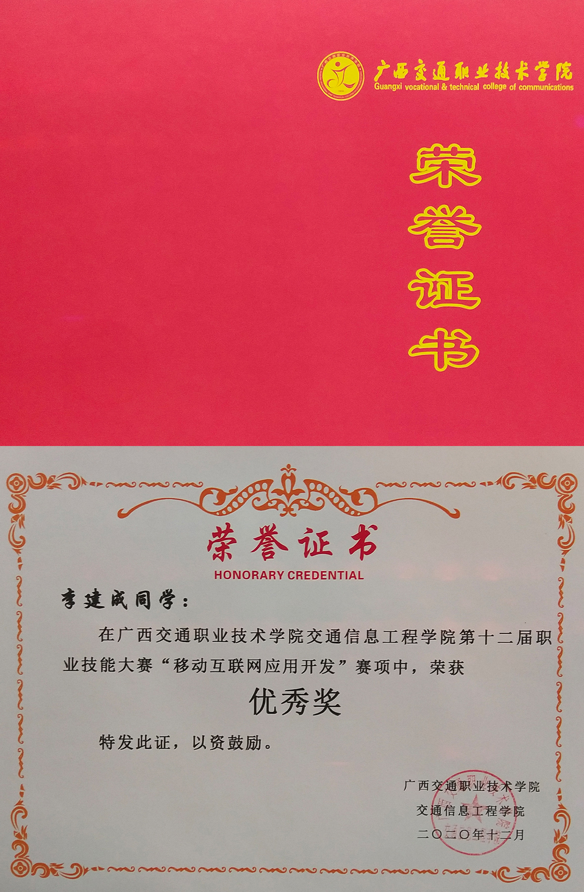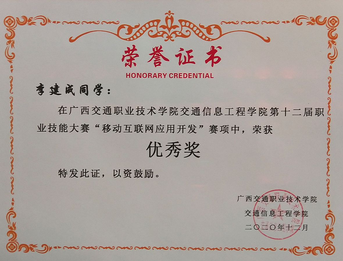 Li jiancheng won the Excellence Award in the "Mobile Internet Application Development" competition of the 12th GXJZY vocational skills competition.