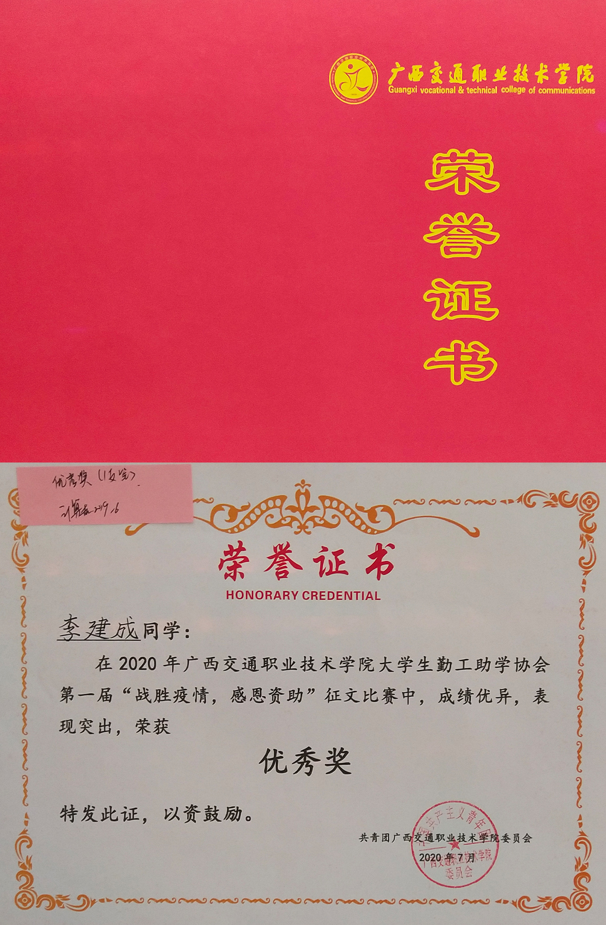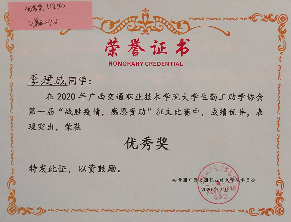Lijiancheng won the excellent award in the first essay competition of "overcoming the epidemic and giving thanks for funding" of GXJZY Work-study Association in 2020.
