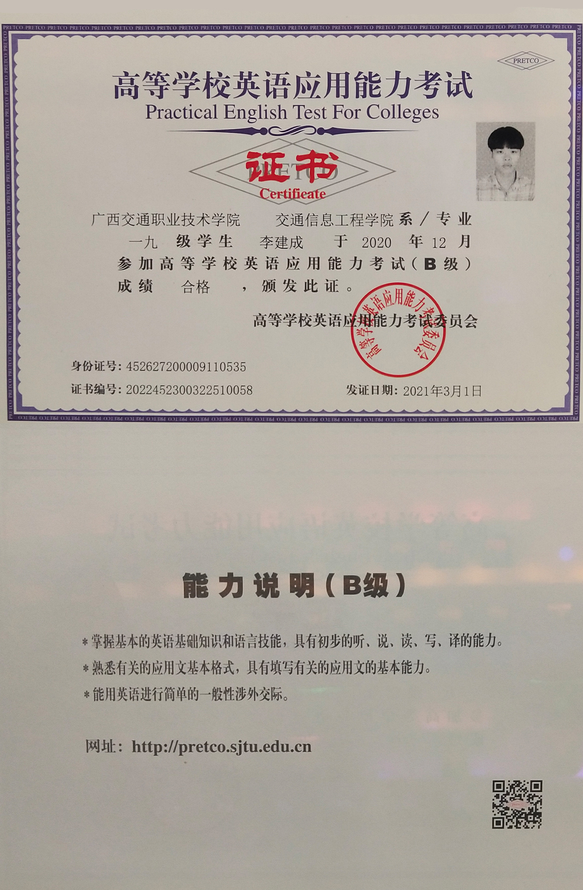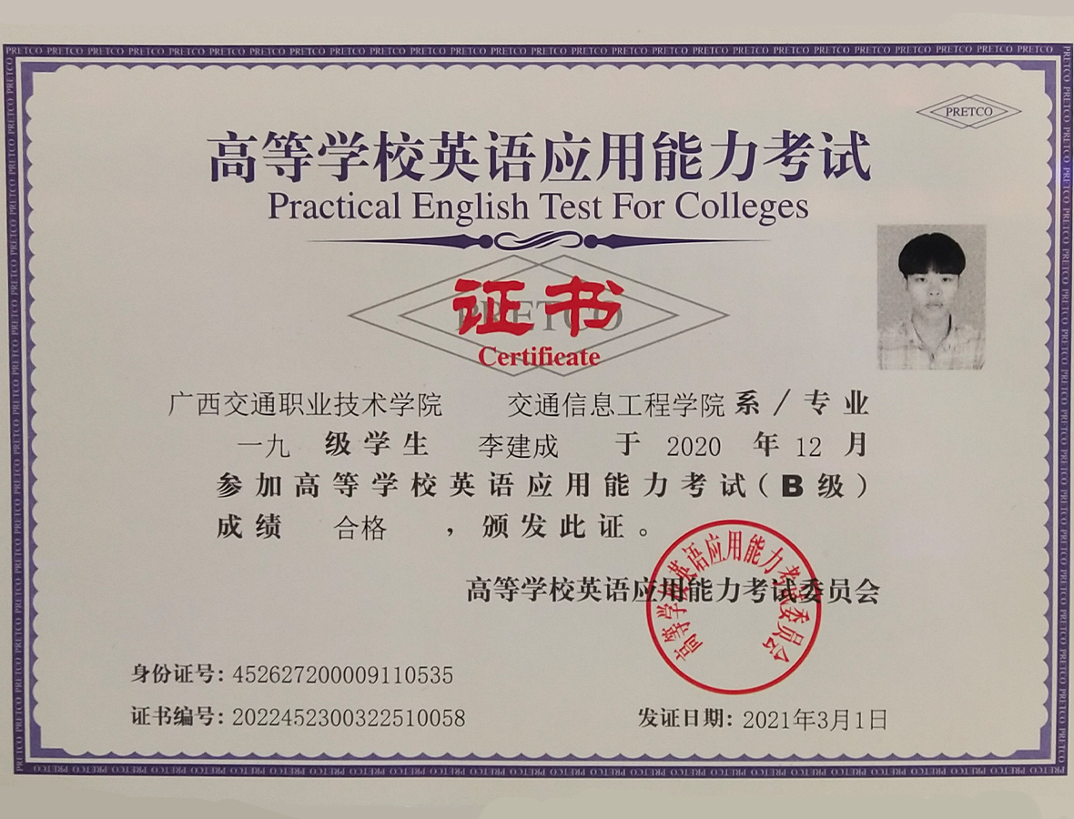 Li Jiancheng, a 2019 student of GXJZY Institute of Traffic Information Engineering, passed the College English Proficiency Test in December 2020.